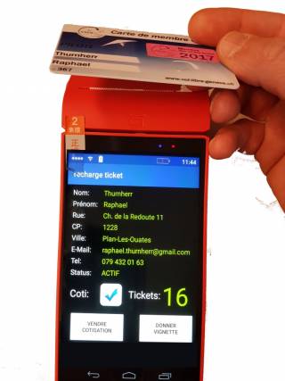 Après retrait de la carte, les coordonées du vendeur, le status de sa cotisation, son solde de tickets s'affichent et des options sont disponible selon les privilèges accordés.