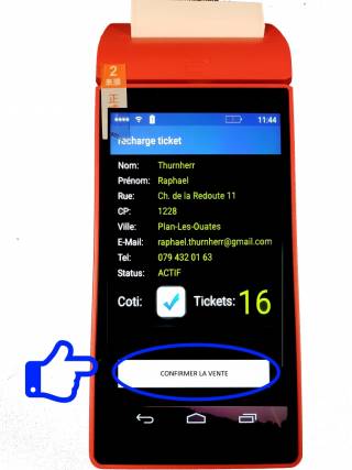 La vente est effectuée et le terminal devrait imprimée un recu à conserver soit par le membre acheteur, soit par le vendeur.