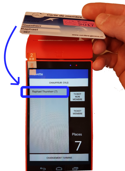 Présenter chaque carte de membre à débiter devant le détecteur. On voit alors la liste des passagers se remplir.