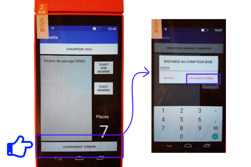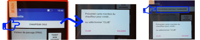 Sur l'écran principal, cliquer sur le bouton "chauffeur" (image 1) puis, comme demandé par le message (image 2), présenter la carte de membre du chauffeur et valider ou, séléctionner CVLG s'il s'agit du chauffeur du CLUB.